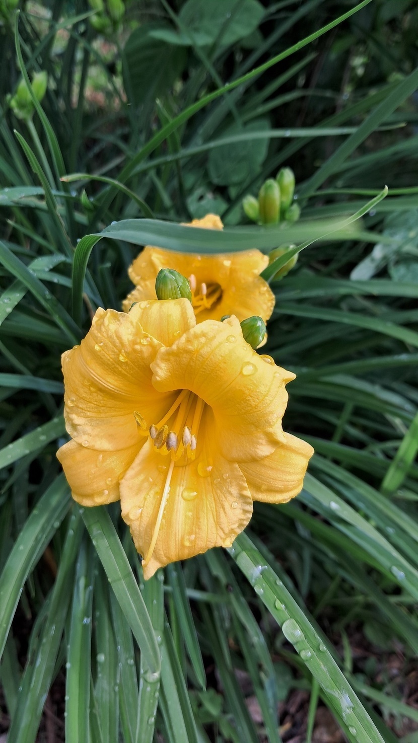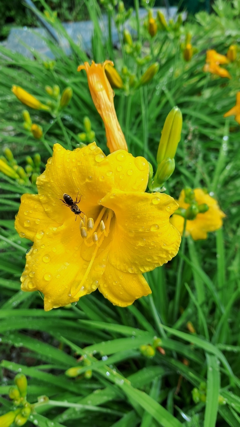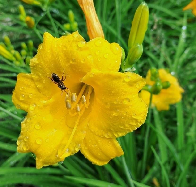 노란 나리꽃에 비 맞고있는 애처로운 벌