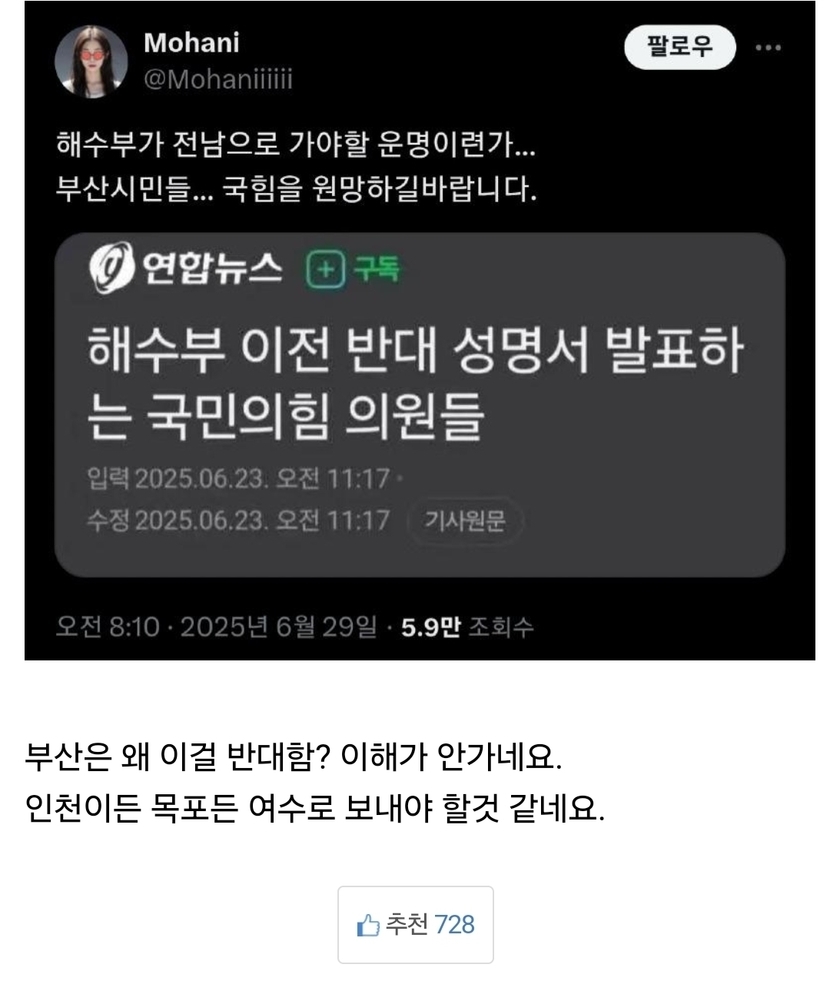 25.06.30 108 읽음 해양수산부가 전남으로 가야 될 운명인가? 가을하늘 좋아^^ 구독하기 5 6 콘텐츠의 수익 3 현 정부와 민주당이 부산 경제를 살리겠다는데국민의 힝은 이걸 왜 반대하는지 이해할 수가 없네 6 0 / 300 입력
