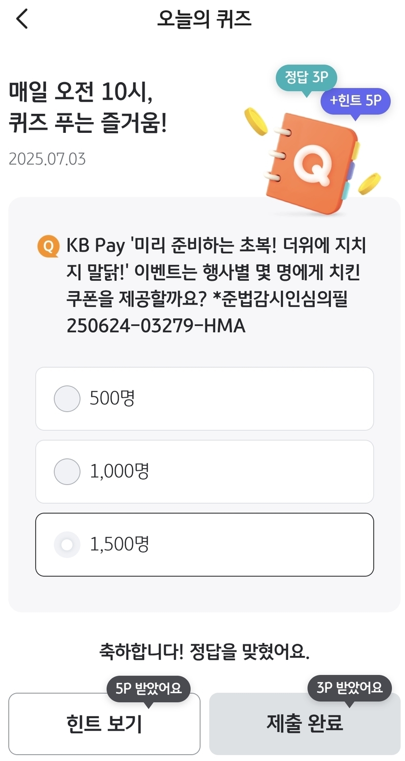 25.07.03 126Β μ½μ πΏπΏβ7/3(λͺ©) KB PAY & μ€νλ± νΉ μ€λμ ν΄μ¦ μ λ΅βπΏπΏ λν 리λ°κ΅΄λ°κ΅΄ ꡬλ νκΈ° 1 2 μ½ν μΈ μ μμ΅ 4 7/3(λͺ©) KB PAY μ€λμ ν΄μ¦ μ λ΅μ λλ€.μ λ΅ : 1,500λͺ KB μ€νλ± νΉ μ€νν΄μ¦ μ λ΅μ λλ€.μ λ΅ : O 2 0 / 300 μ λ ₯