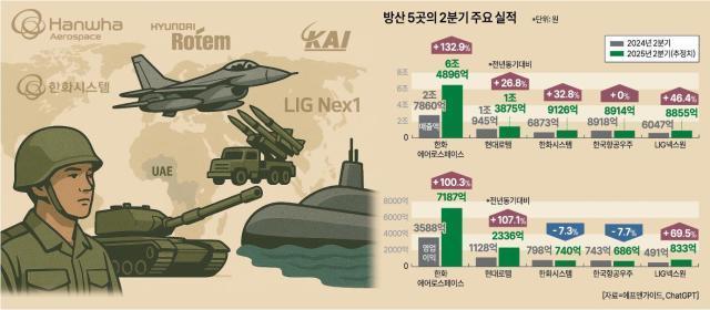 15일 금융정보업체 에프앤가이드가 집계한 국내 대형 방산업체 5곳(한화에어로스페이스, 현대로템, 한화시스템, 한국항공우주, LIG넥스원)의 2분기 매출액은 10조5666억원, 영업이익은 1조1782억원으로 전년 동기 대비 각각 74.2%, 74.6% 증가할 것으로 예상된다. 분기 기준 5개 기업 통합 매출액이 10조원, 영업이익이 1조원을 넘긴 건 이번이 처음이다.