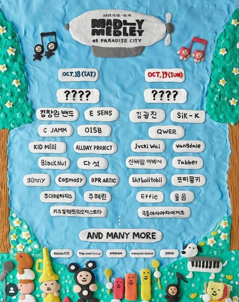 음악 페스티벌 '매들리 메들리'에는 김창완 밴드, 김광진, 이센스, 식케이, QWER, 올데이 프로젝트, 씨잼 등이 출연한다. 아직 헤드라이너는 공개되지 않은 상황이다. 가격 논란과 함께 첫날 헤드라이너로 지드래곤이 출연한다는 소문이 돌아 기대감을 사고 있다.