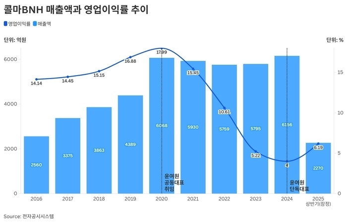 콜마비앤에이치는 지난해 말 매출액 6156억원, 영업이익 246억원을 기록했다. 2020년부터 지난해까지 매출은 6000억원 안팎을 오갔지만, 같은 기간 영업이익은 약 77% 줄었다.