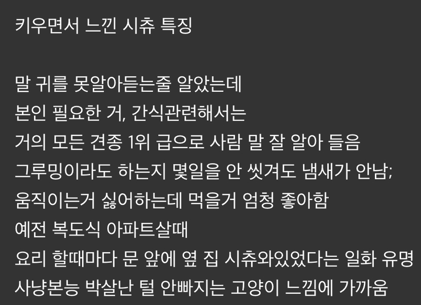 25.07.21 172 읽음 전형적인 반려견처럼 생겼는데 막상 키워 보면 강아지 느낌 잘 안나서 당황 flyfunny79 구독하기 5 4 콘텐츠의 수익 6 시츄개 특유의 발발거림이 거의 없음산책 보챔도 없고 나가기 귀찮아함창문 구경이나 독립적으로 노는거 좋아함아파도 티 안내서 모르는경우 많음누구와도 나와보지도 않아서 손님이 개 있는거 모르는 경우도 많음ㄹㅇㅋㅋㅋㅋㅋㅋ 진짜 그럼 밥 잘먹는 할머니 모시고 사는 느낌 조용한데 똑똑하고 고집쎄서 하기싫은거만 절대 못 알아듣는척해서 훈련율이 낮은것도 우리 할머니 느낌임 4 0 / 300 입력