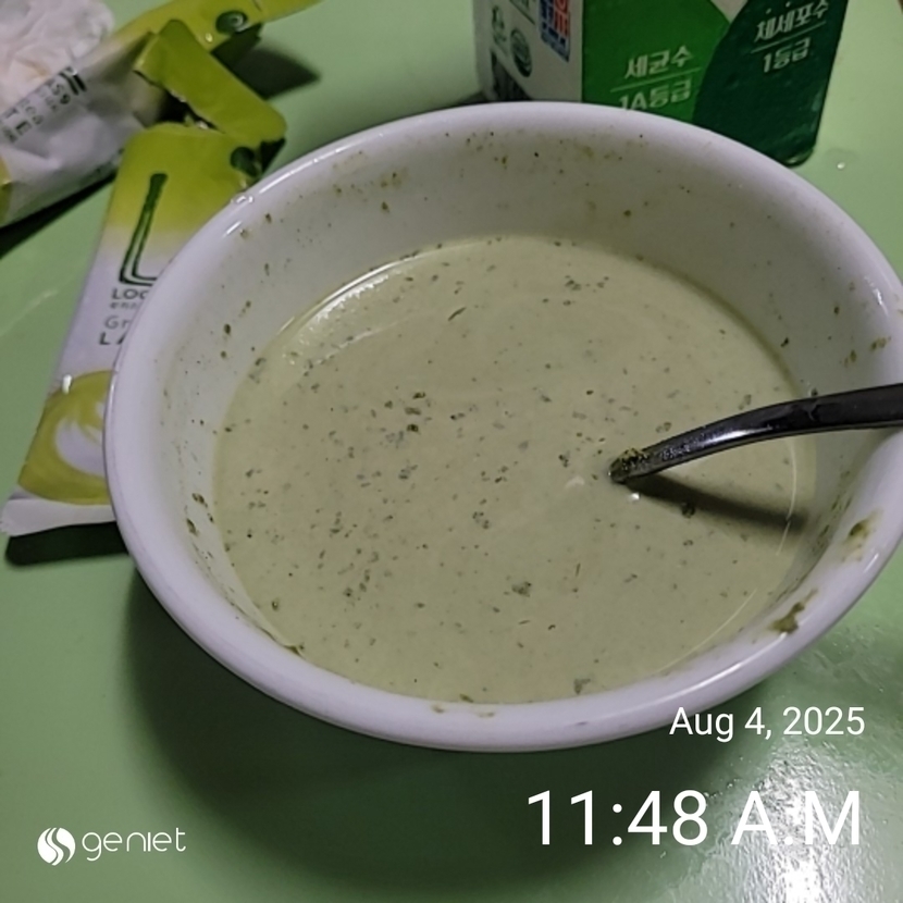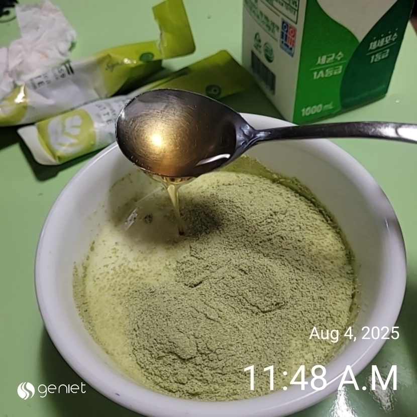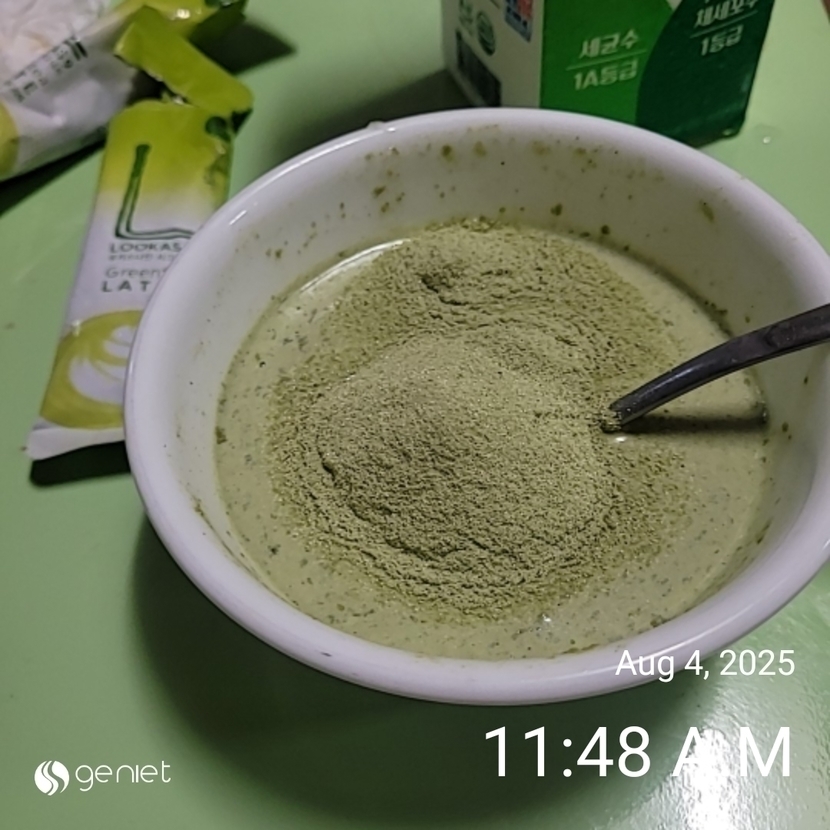 녹차라떼 2포 풀어. 술술 저어