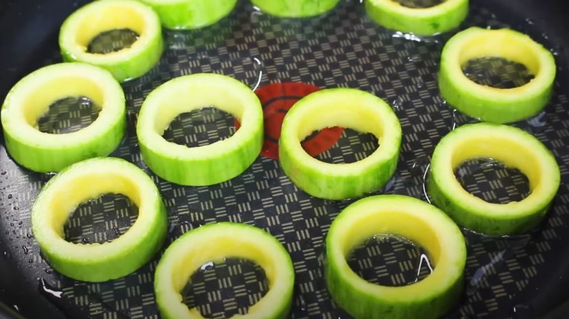 먼저 애호박은 1cm 두께로 동그랗게 썬다. 그다음 생수병 뚜껑이나 비슷한 크기의 틀로 가운데를 꾹 눌러 속을 뚫는다. 다 뚫은 호박 링을 팬에 먼저 올리고, 기름을 두른 뒤 약한 불로 달군다. 미리 소금 약간을 넣어 풀어둔 계란물을 숟가락으로 부어 구멍 속을 채운다. 팬을 살짝 기울이거나 뚜껑을 덮어 약불에서 서서히 익히면 계란물이 흐르지 않고 예쁘게 굳는다. 양면을 노릇하게 구워내면 완성이다. 남은 속 부분은 따로 볶거나 부침에 넣어도 좋다.