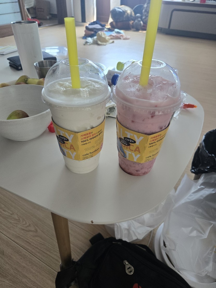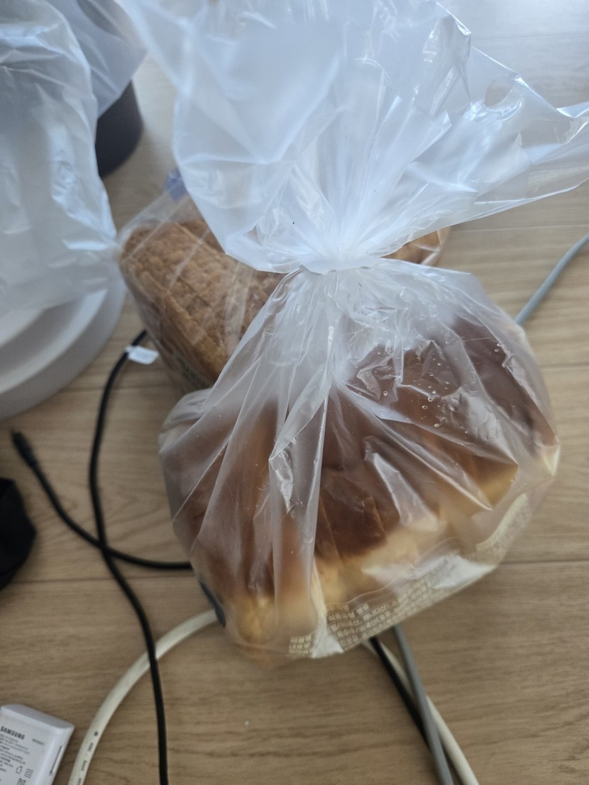 지금 시원한 음료와 빵 두보따리