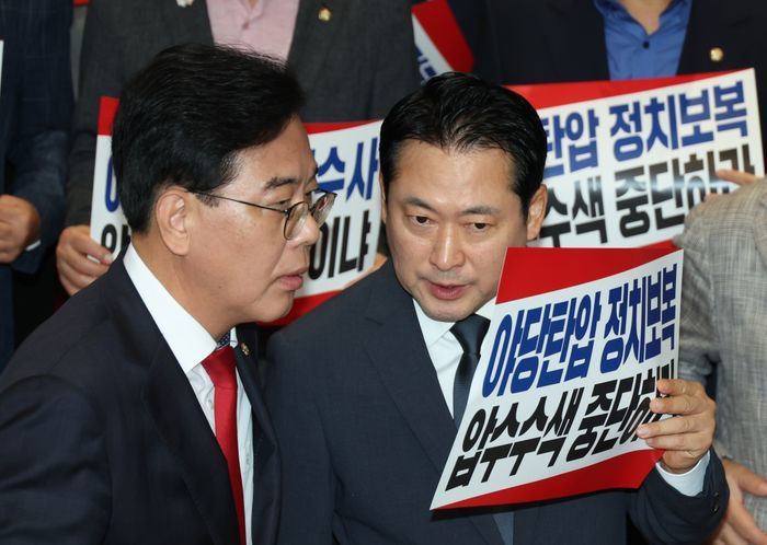 장동혁 대표는 3일 여의도 국민의힘 중앙당사에서 열린 원외당원협의회 운영위원장 협의회 확대운영위원회의에 참석해 "특검(특별검사)이 당사 압수수색에 이어 국민의힘의 심장인 원내대표실과 원내행정국까지 압수수색하겠다고 협박하고 있다"며 이같이 밝혔다.