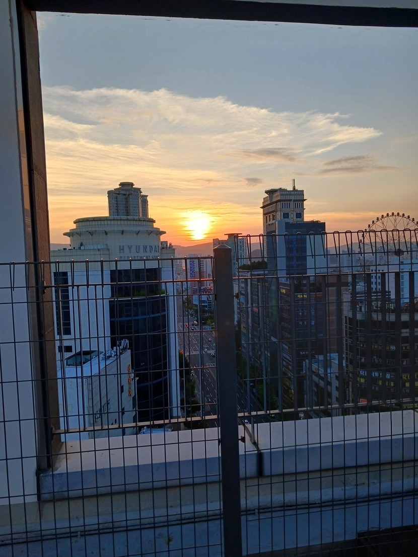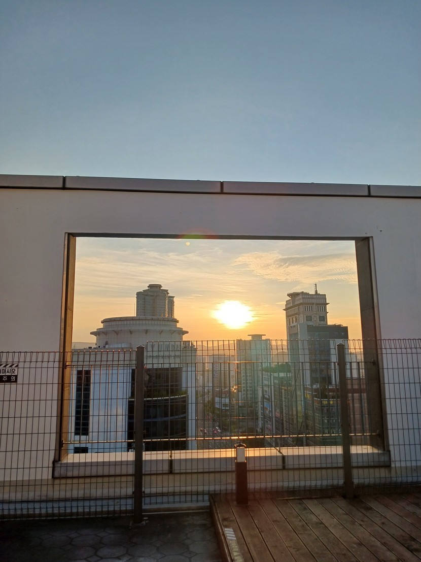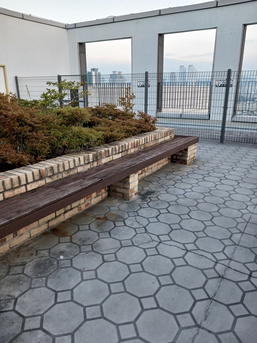 환한 햇살 받으며 옥상 야외정원에서 걷는중