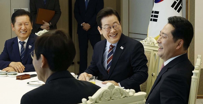 이 대통령은 8일 서울 용산 대통령실에서 정청래 더불어민주당 대표, 장동혁 국민의힘 대표와 오찬 회동을 하면서 모두발언을 통해 "나는 민주당 출신 대통령이긴 하지만 이제는 국민 모두의 대통령이 돼야 한다"라면서 이같이 밝혔다.