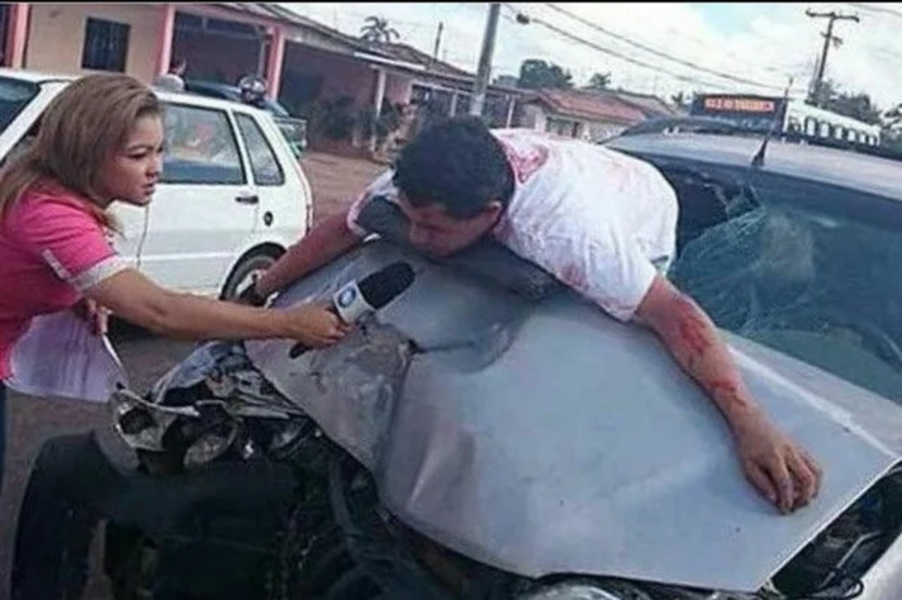교통사고 당한 피해자를 인터뷰하는 리포터