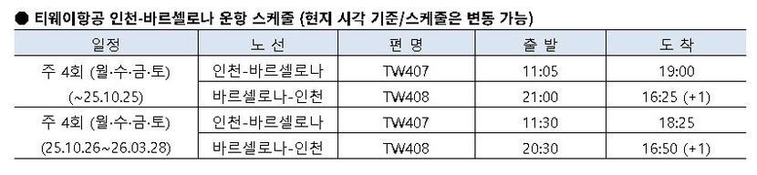 티웨이항공, 인천-바르셀로나 노선 1주년…꾸준한 성장세
