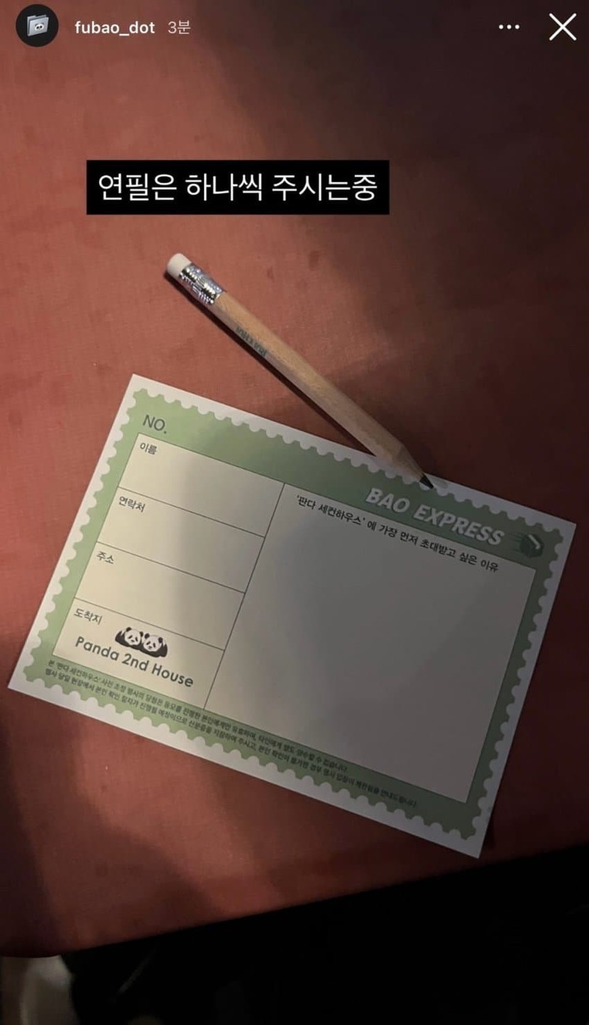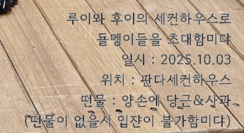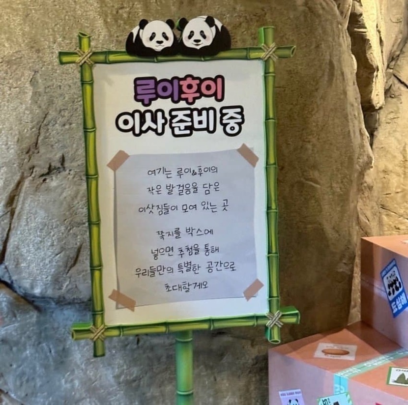 루이후이 이사 준비 중루이후이 이삿짐오바오) 루이야 뭐해? 루) 우디 이삿짐 지켜여오바오) 루이후이 이삿짐 아무도 안 가져가~ 걱정마~루) 그래도 판다일이라는게 혹시 모르는 거잖아요오바오) 여기 CCTV도 있고 진짜 걱정 안해도 돼루) CCTV 보다는 루씨티비가 더 마음이 놓여요루) 거기! 웬놈이냐!!!!!!!!!돌) 우...우리야 루이야... 쪽지 쓰러 왔어돌) 우리 쪽지만 쓰고 금방 갈거야루) 진짜 쪽지만 쓰고 가는거지?돌멩이들이 쪽지만 쓰고 가는지 숨어서 지켜보는 루이그렇게 밤 늦게까지 이삿짐을 지키던 루이자정쯤 퇴근하고 들어와 공부하나 싶었는데 집들이때 받고 싶은 선물 목록 작성하는 중이라고 함