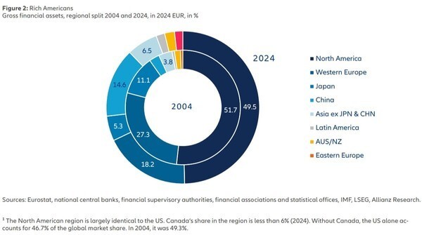 2024년 전 세계 금융자산 증가분의 53.6%가 북미에서 창출됐다. 지난 20년간 평균은 48.5%였다.