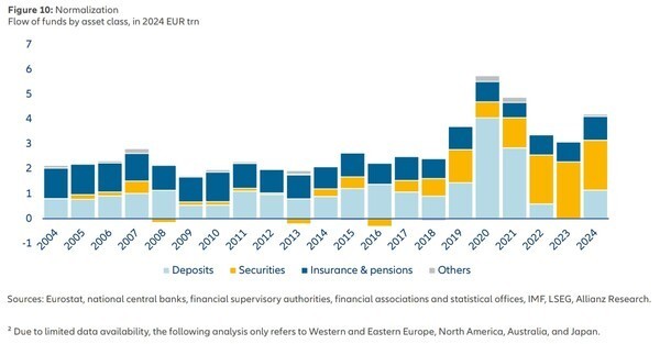 하지만, 2024년에는 신규 저축의 28%가 다시 은행으로 흘러들었다. 이는 팬데믹 이전(40% 이상)에 비하면 여전히 낮지만 최근 2년보다는 높은 수치다.