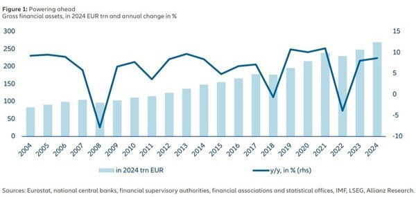 금융자산은 전년(8.0%)보다 더 높은 8.7% 증가율을 기록했다. 그 결과 2024년 말 기준 전 세계 금융자산 총액은 300조달러를 넘어서며 새로운 절대적 기록을 세웠다.