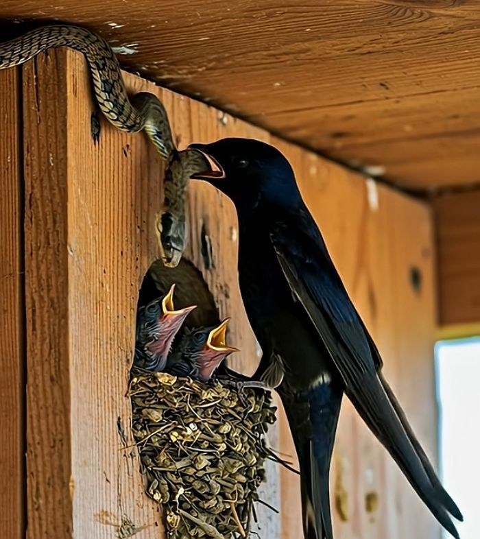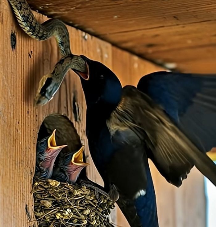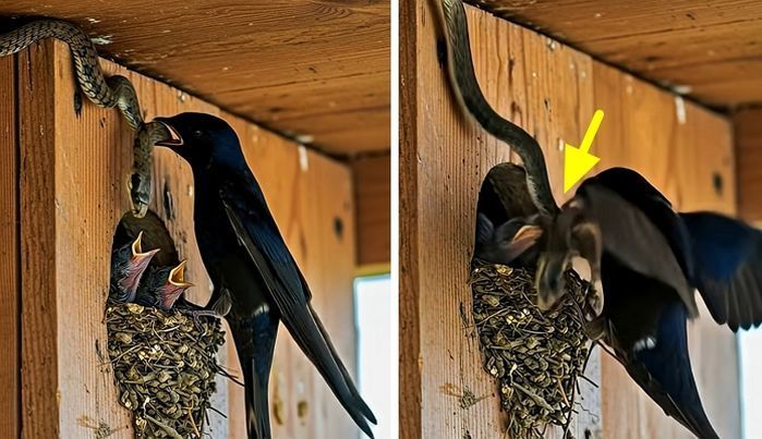 아기 새들 잡아먹히기 직전 0.1초만에 뱀 막아낸 어미새의 찰나의 순간
