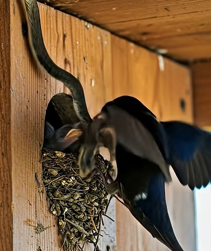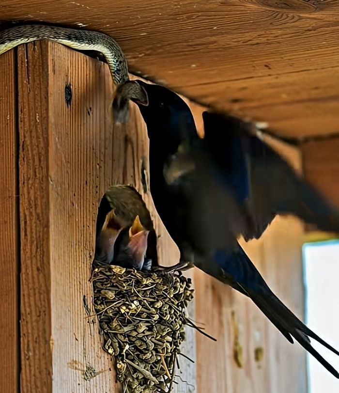 뱀의 머리가 아기 새들에게 닿기 바로 직전, 어미 새는 뱀의 머리 부분을 정확하게 물고 격렬하게 흔들며 침입을 막아섰습니다.