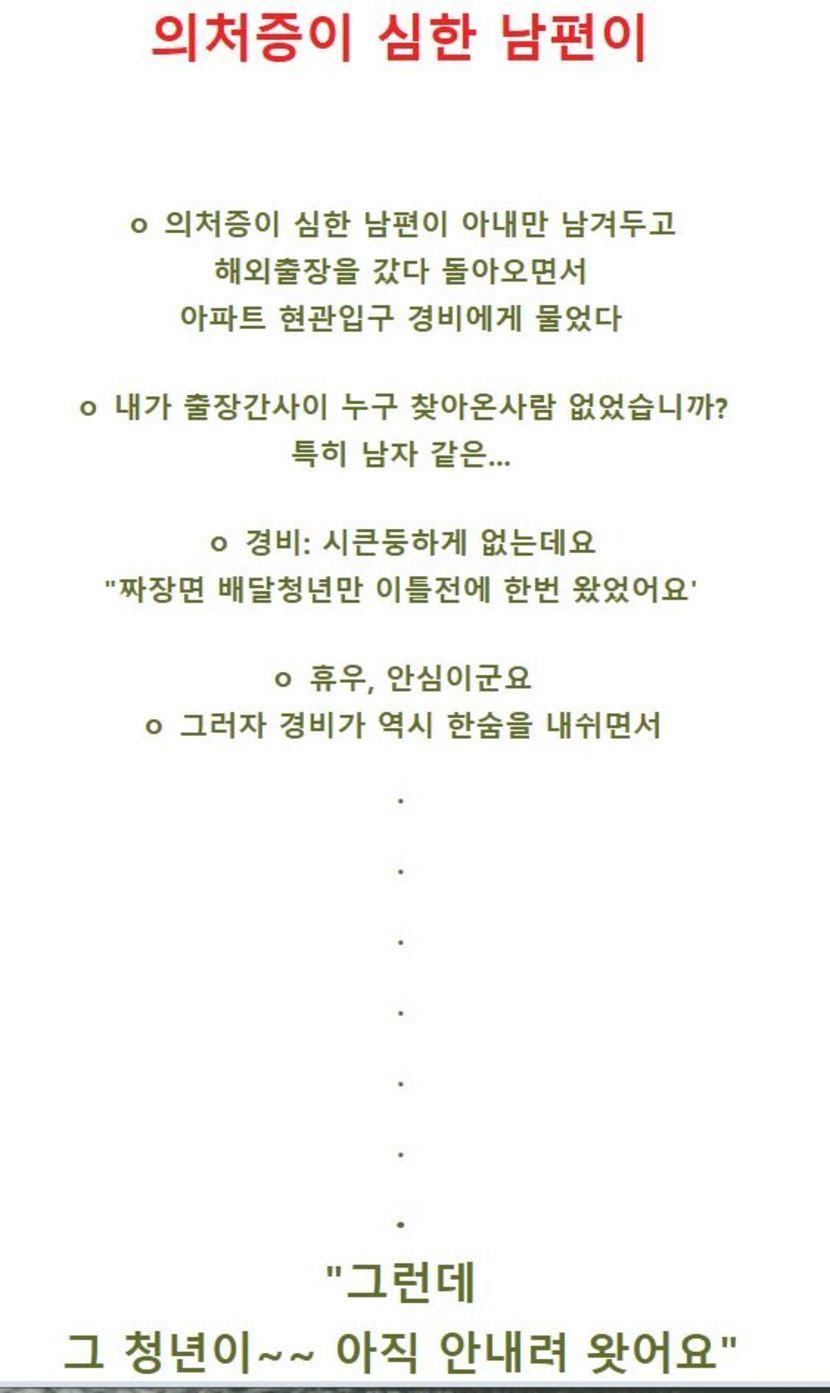 실제로 바람을 피워서 의부증이나 의처증이 걸리는 경우도 있겠지만 의심이 쌓이고 쌓여서 그 원인이 될 수도 있거든요.