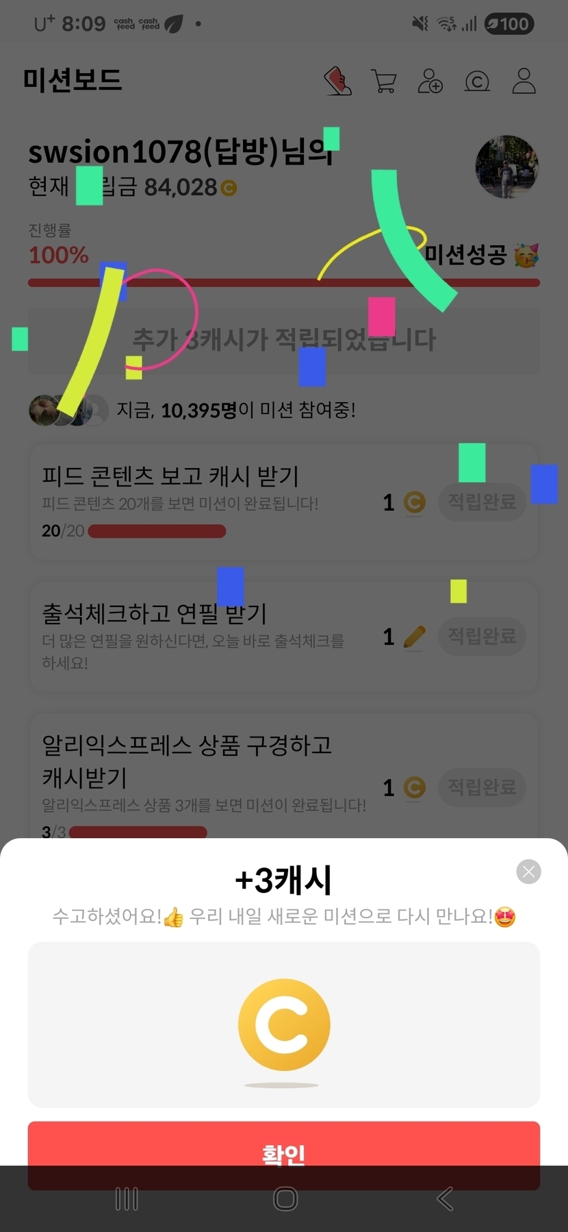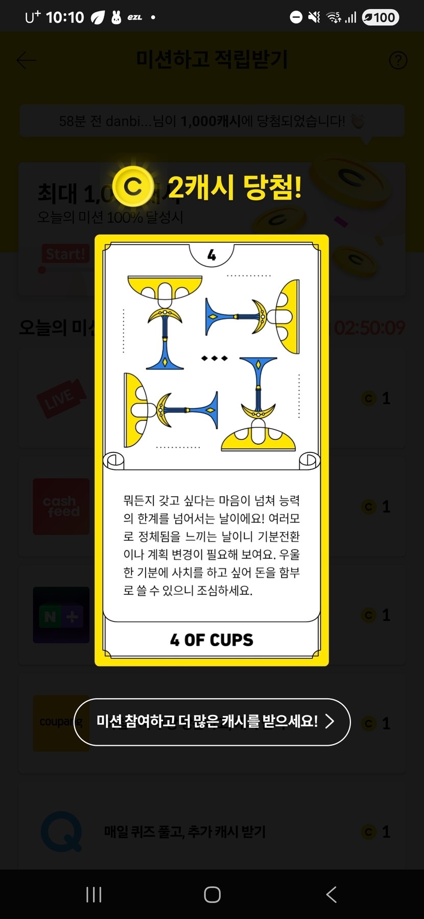 25.10.15 132 읽음 랜덤캐시,미션보드 미션완료!! swsion1078(답방) 구독하기 17 19 콘텐츠의 수익 5 10월15일 랜덤캐시 미션완료 7캐시, 미션보드 미션완료 3캐시, 타로카드는 2캐시, 비디오시청은 3캐시 받았어요. 19 0 / 300 입력