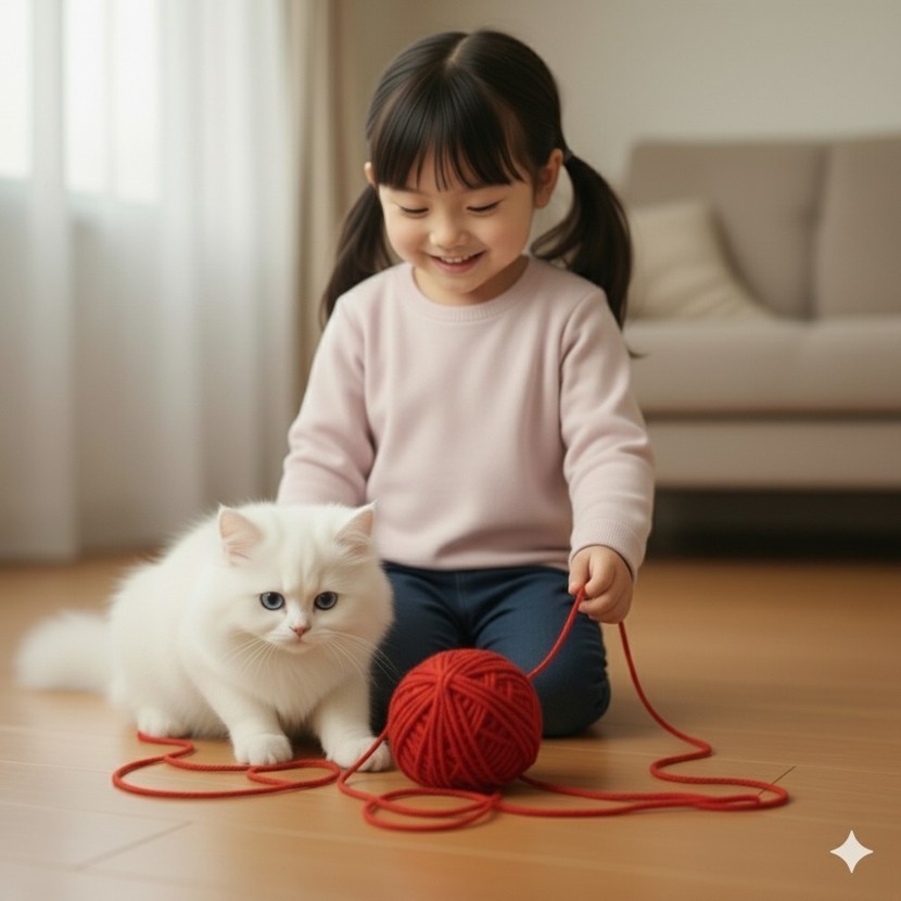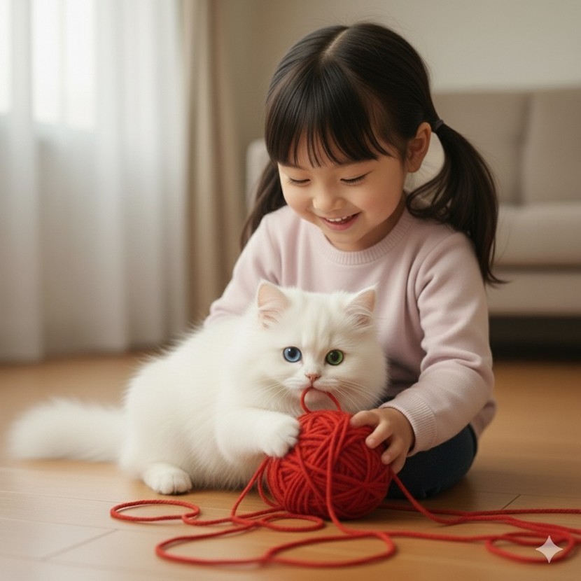 고양이와 아이의 공동 관심사.