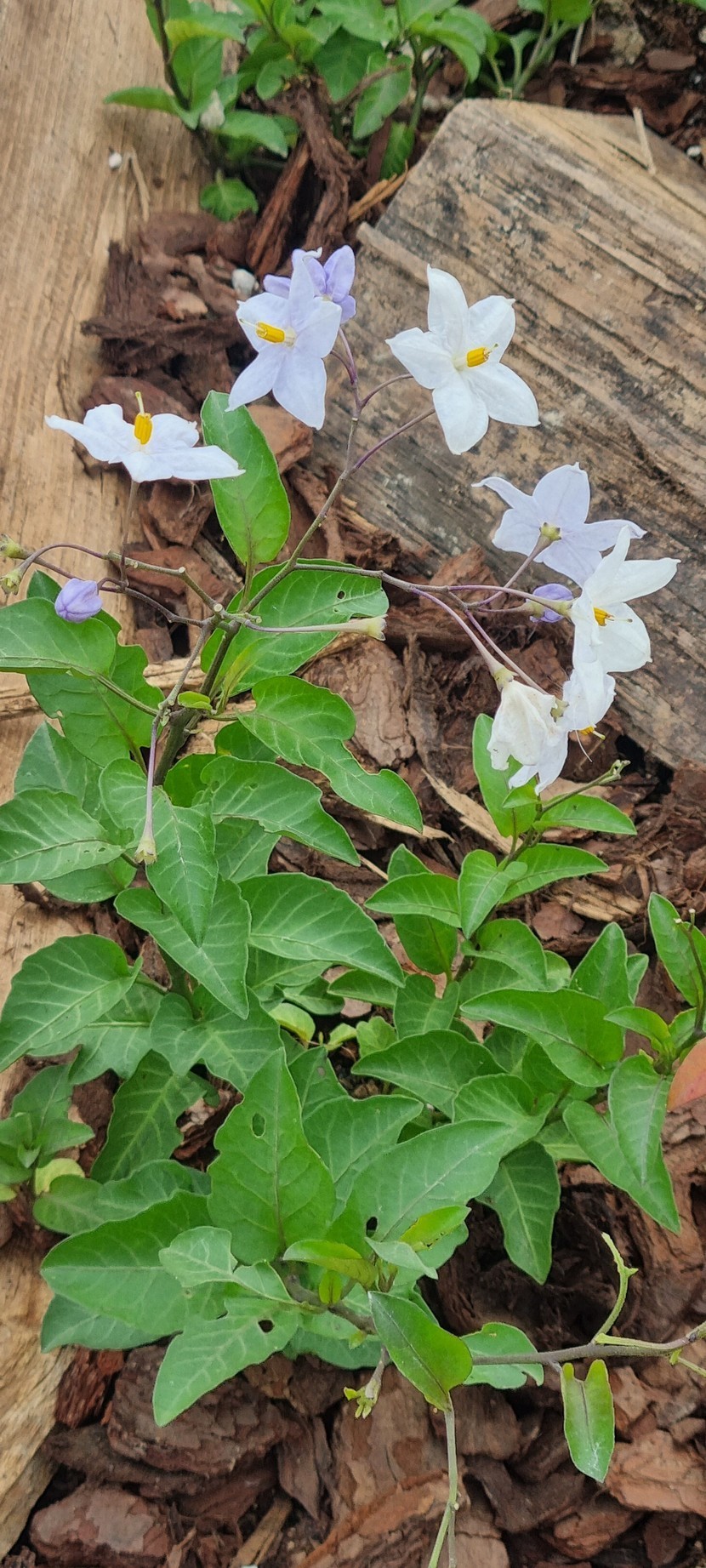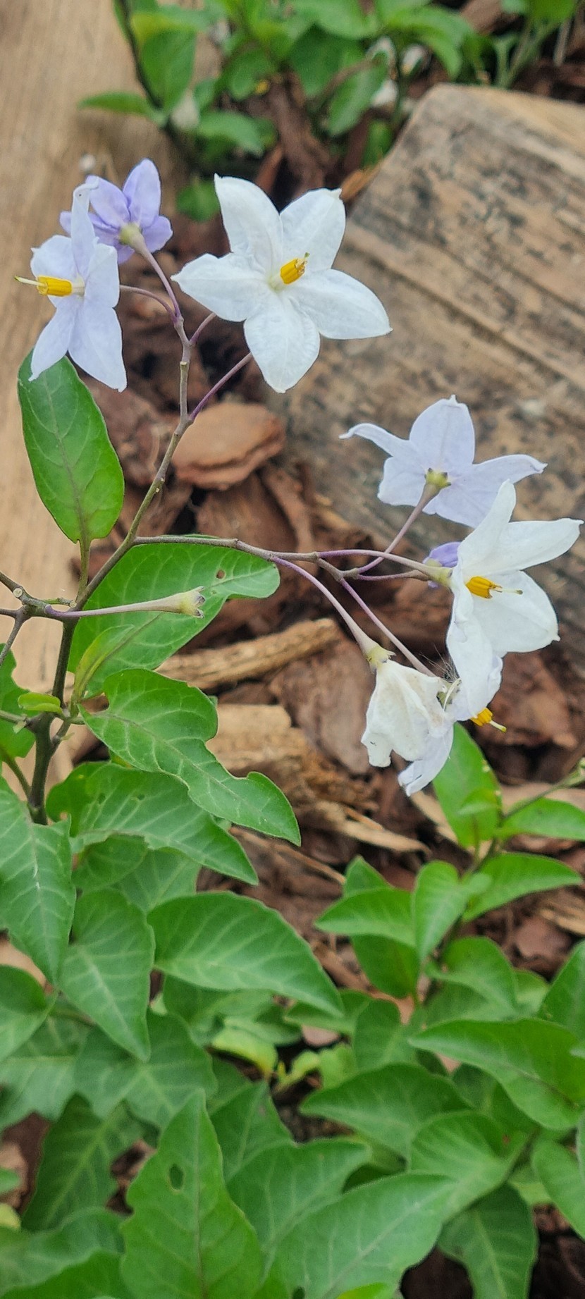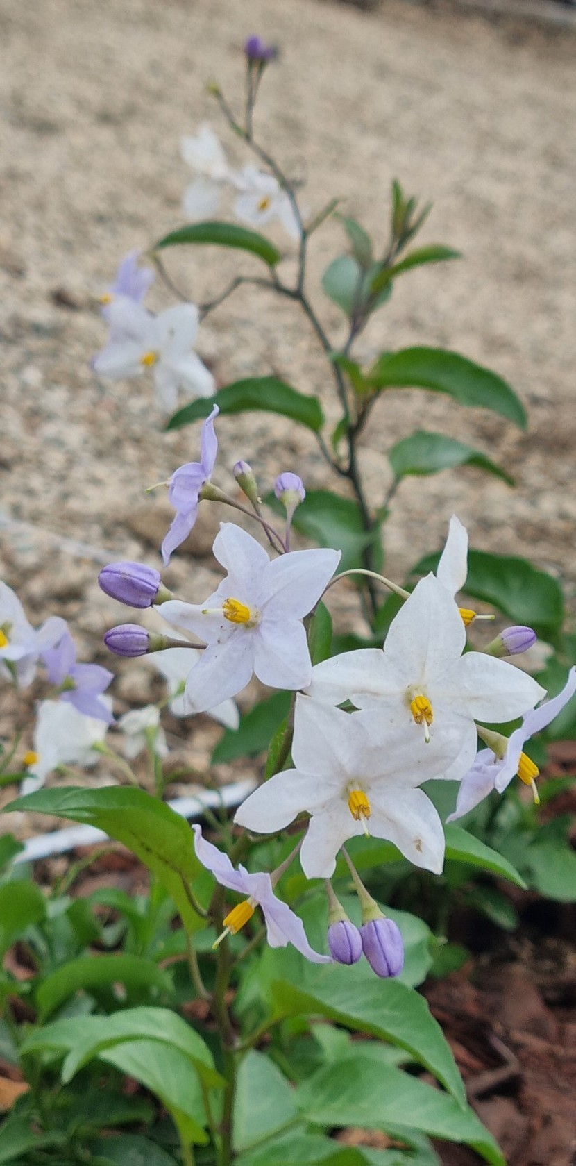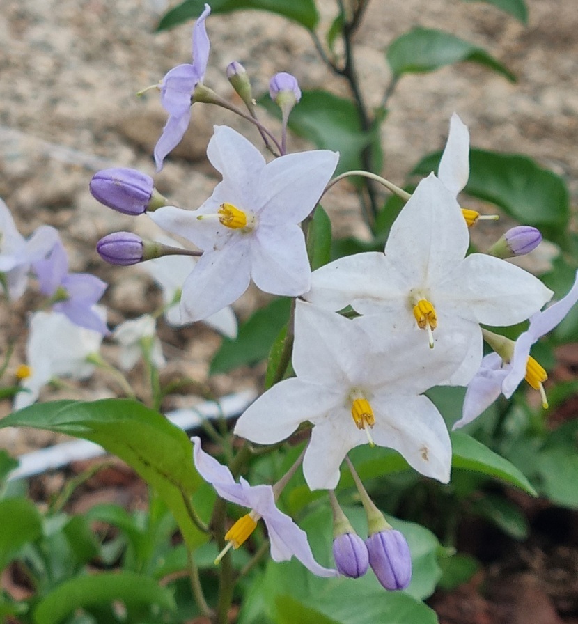 가지 끝에 흰색~옅은 푸른색인 별모양의 꽃이 20여개씩 모여 핍니다. 꽃은 봄에 가장 많이 피지만 연중 산발적으로 피며 자스민 향기가 있습니다.