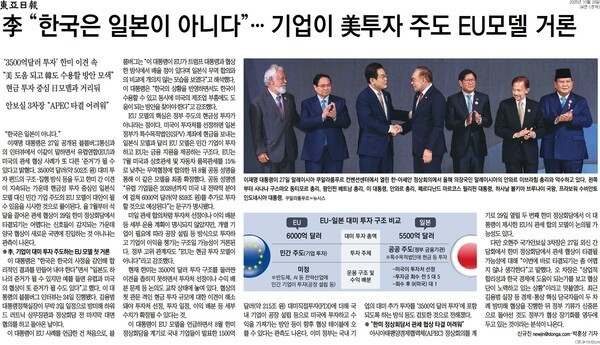 조선일보는 28일자 4면 「李 “지연이 실패는 아니다” 내일 한미회담서 타결 힘들듯」 기사에서 “협상 국면이 연말까지 이어질 수 있다는 전망”이라고 했다. 조선일보는 “최근 미 측은 3500억 달러 직접 현금 투자 요구를 조정해, 매년 250억 달러씩 8년간 2000억 달러를 분할 투자하는 방안을 수정 제안한 것으로 전해졌다”며 “이를 수용하지 않고 ‘버티기’에 들어간 것은 국내 여론을 의식해서로 볼 수 있다. 미국 요구대로 따랐다가는 미국에 국익을 내줬다는 여권 지지층 반발을 이겨내기 힘들다는 것”이라고 했다.