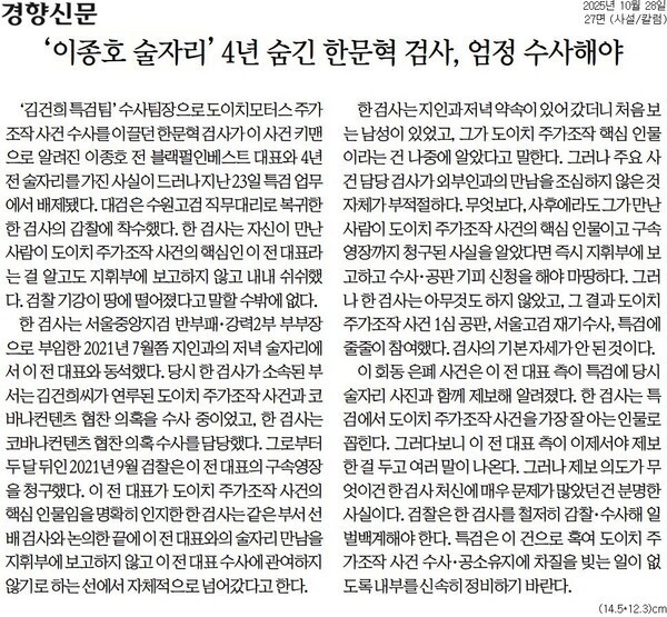 동아일보는 28일 「‘도이치 주포’와 술자리 후 수사, 재수사, 특검도 한 부장검사」 사설에서 “도이치모터스 사건과 관련해서는 ‘친윤 검사’들이 검찰총장까지 ‘패싱’해 가면서 김 여사에 대해 특혜성 ‘출장 조사’를 한 뒤 불기소 처분을 하면서 검찰의 신뢰가 땅에 떨어진 상태다. 의혹을 철저히 규명하지 않으면, 검찰의 설 자리가 갈수록 좁아질 것”이라고 했다.