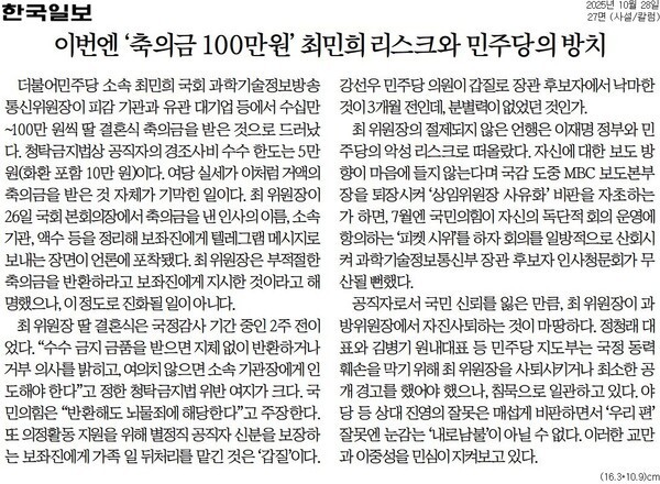 국정감사 기간 자녀 결혼식 논란부터 MBC 보도본부장 퇴장 사태까지 최민희 더불어민주당 의원 관련 보도가 이어지고 있다. 조선일보는 28일자 8면 「민주당도 이젠 부담스럽나, 커지는 최민희 사퇴론」 기사에서 “여권 내에서도 이재명 정부의 주력 사업인 AI 등 첨단 기술 정책을 뒷받침해야 할 과방위원장이 연일 구설에 오르자 상황을 심각하게 보고 있는 것으로 알려졌다”고 보도했다.