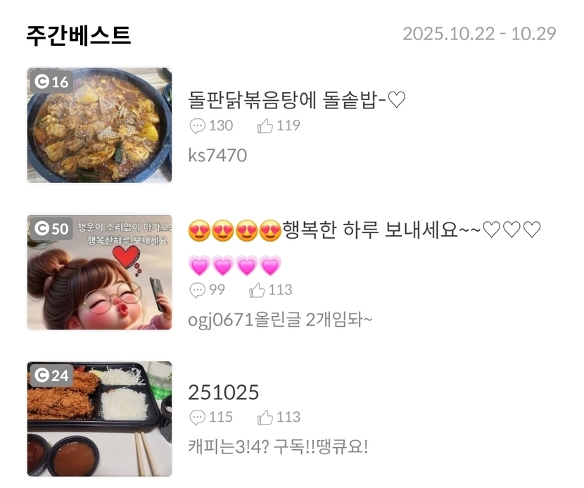 25.10.30 789 읽음 251029 캐피는3!4? 구독!!땡큐요! 구독하기 132 124 콘텐츠의 수익 23 쫑파티등심비냉항정살양념갈비주간베스트감사합니다 하나의 영향력 오늘도 웃는 좋은하루되세요 124 0 / 300 입력