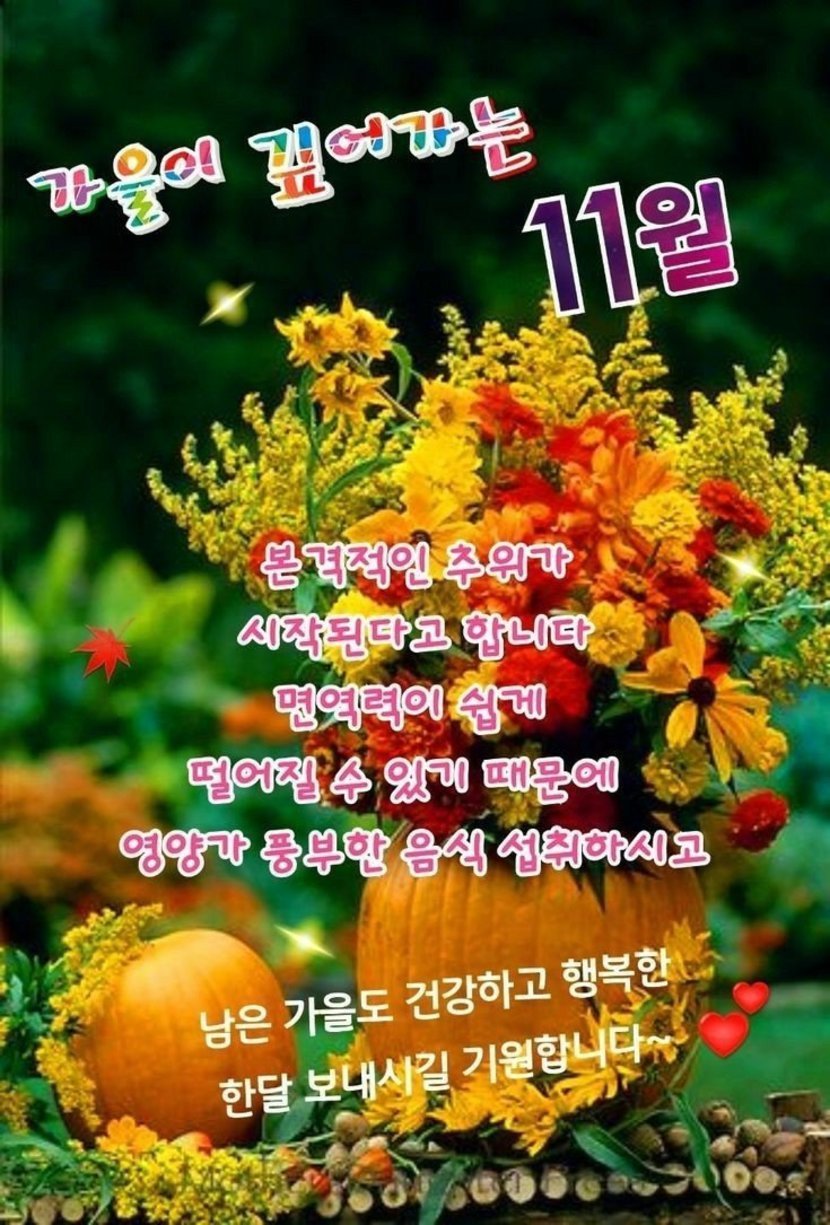 25.11.01 3,397 읽음 새롭게 시작되는 11월 더욱 멋지고 행복한 날들 보내시길 바랍니다 달맞이꽃0925 구독하기 53 59 콘텐츠의 수익 352 ♤♤♤♤♤♤ 59 0 / 300 입력