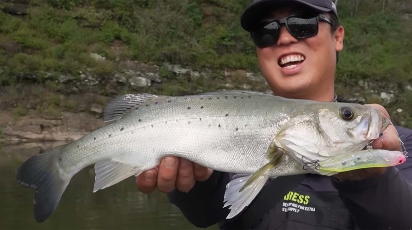 하지만 진짜 놀라운 순간은 그 다음이었다. 스틱 베이트를 수면 가까이 붙여 운용하던 중 강한 입질이 왔다. "배스 같이 생겼는데"라고 말하며 물고기를 끌어올린 신 씨는 곧 놀라움을 감추지 못했다. 잡은 물고기가 점농어였기 때문이다.