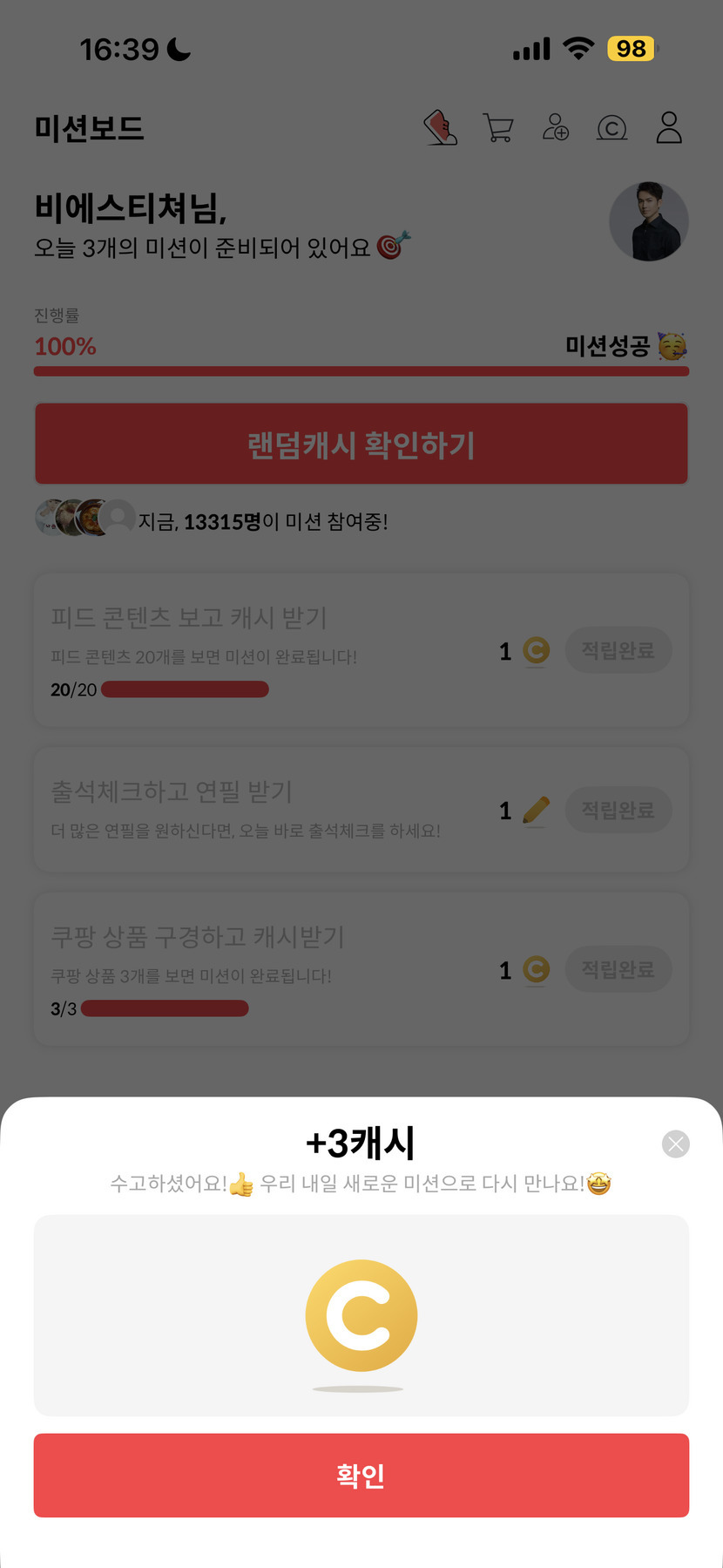 25.11.06 118 읽음 11월 6일 캐시피드 미션 완료 비에스티쳐 구독하기 13 15 콘텐츠의 수익 5 오늘은 안타깝게도 나쁜 친구 3캐시를 피하지 못했습니다.내일은 캐시 많이 받을수 있었으면 좋겠습니다.기온 내려가는데 건강 조심하시고 해피한 오후 보내세요:) 15 0 / 300 입력