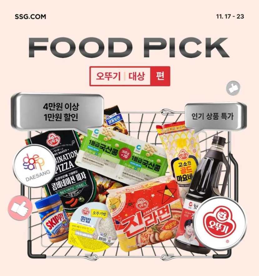 이번 행사는 17일부터 23일까지 진행되며 대상과 오뚜기의 주요 상품을 2개 이상 구매할 경우 50% 할인과 원 플러스 원 혜택을 제공한다. 대상 부문에서는 종가 맛김치(800g)와 청정원 순창쌈장(500g)이 2개 이상 구매 시 반값으로 판매된다.