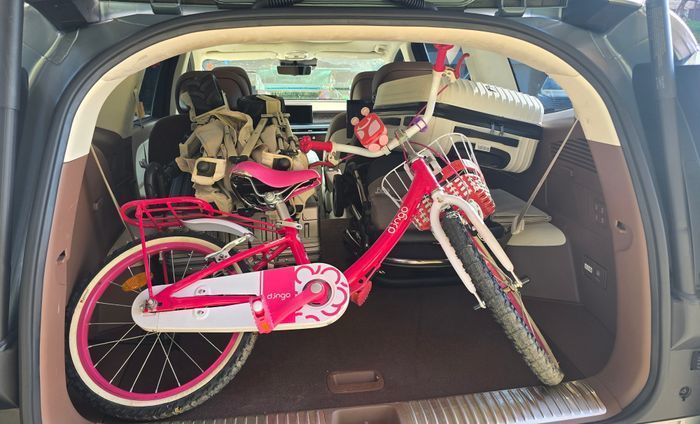 이 차이가 만드는 실내 공간감, 트렁크 활용성은 숫자 이상의 체감 차이를 만든다. 실제 18인치 자전거 1대와 28인치 캐리어, 24인치 캐리어, 휴대용 유모차 1대, 웨건까지 '테트리스 수납' 할 필요도 없이 넣고도 여유 공간이 남았다. 아이와 함께하는 일상에서 짐이 많아 늘 "뭐부터 포기해야 하나…" 고민하던 엄마 입장에서는 그야말로 감격스러운 수준이다. 캠핑, 장거리 여행, 쇼핑 등 짐이 많은 활동을 하는 가족이라면 트렁크 하나만으로도 선택의 이유가 충분한 차다. 엄마에게는 말그대로 '짐 싸기 스트레스가 사라지는 차'였다.