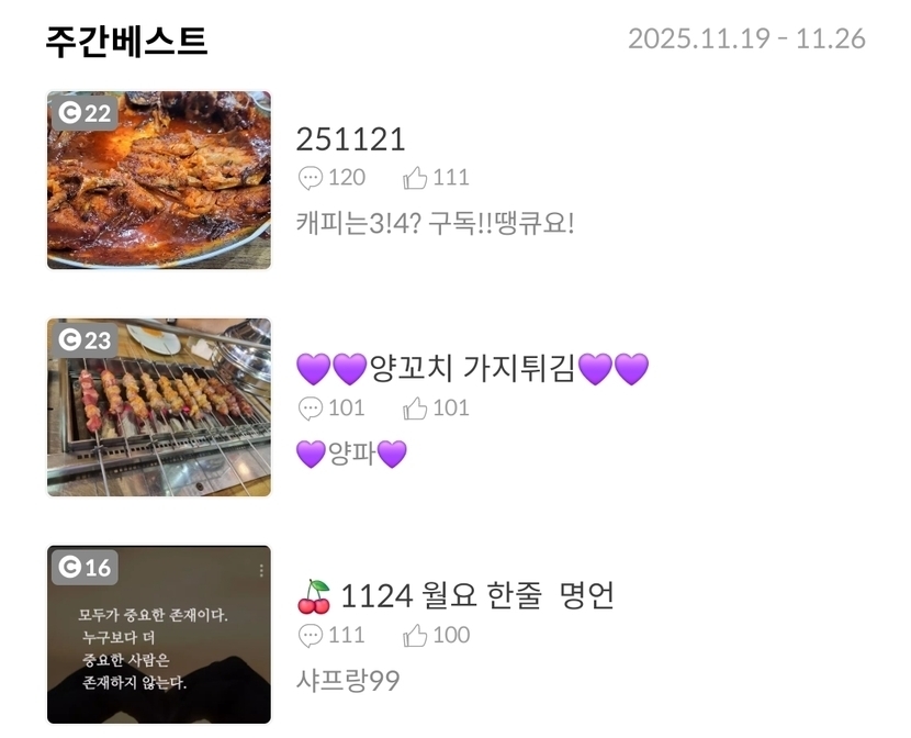 1주 전 671 읽음 251126 캐피는3!4? 구독!!땡큐요! 구독하기 121 116 콘텐츠의 수익 24 짜파게티저번에 밥 못비벼서자작하게주간베스트 감사합니다 간만에숫자놀이오늘도 웃는 좋은하루되세요 116 0 / 300 입력