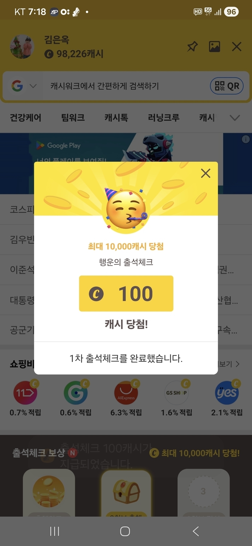 100캐시받았어요