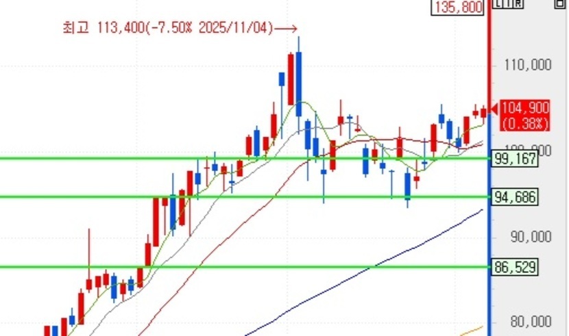 94600원 자리를 3번 지켜주고 105000원 부근까지 상승했다가 다시 10만원까지 밀리고 다시 105000원 부근까지 상승.