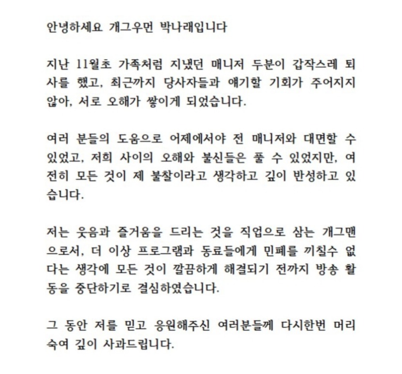 이후 박나래가 직접 입을 열었다. 박나래는 인스타그램을 통해 "저는 웃음과 즐거움을 드리는 것을 직업으로 삼는 개그맨으로서, 더 이상 프로그램과 동료들에게 민폐를 끼칠 수 없다는 생각에 모든 것이 깔끔하게 해결되기 전까지 방송 활동을 중단하기로 결심했다"라고 밝혔다. 그는 현재 출연 중이던 MBC '나 혼자 산다', tvN '놀라운 토요일' 등 예능 프로그램에서 모두 하차한 상황이다.