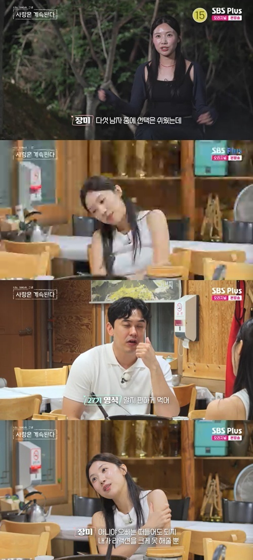 27기 영식과 식사를 하던 장미는 "확실히 마지막 날이 되니까 체력이 거의 소진돼서"라고 했고 영식은 "알지 편하게 먹어"라고 말했다. 영식은 "다른 사람들한테 이성적 텐션이 높지 않아서"라는 장미의 말에 "그래서 그 결과물이 괜찮아? 그런데 미안한데"라고 말했다.