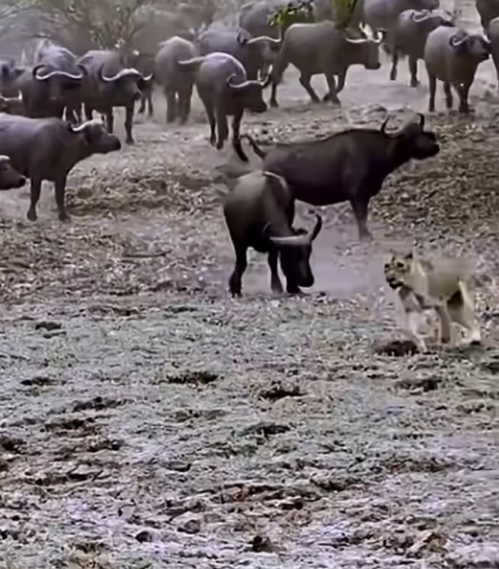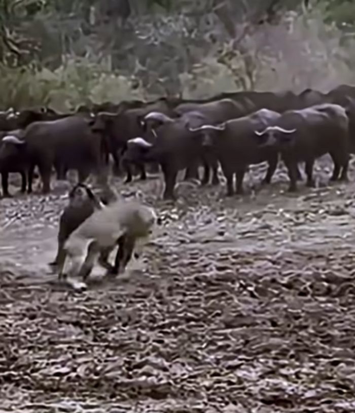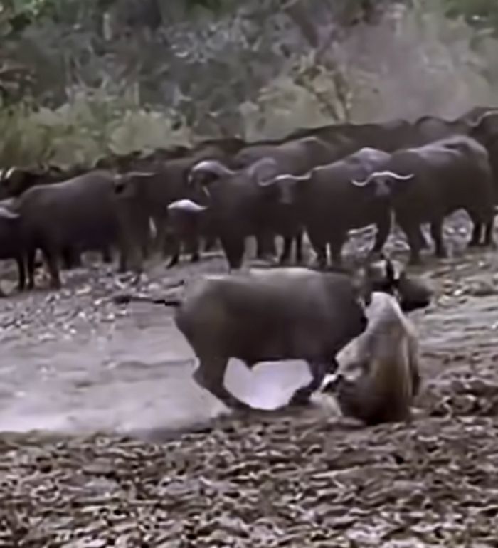 한 마리의 사자가 물소 사냥에 나섰다가 뜻밖의 강력한 저항에 부딪혔습니다.