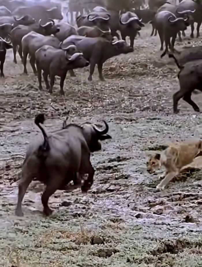 그러나 하필 그 순간, 사자의 도주 경로 뒤편에는 또 다른 물소가 기다리고 있었습니다.