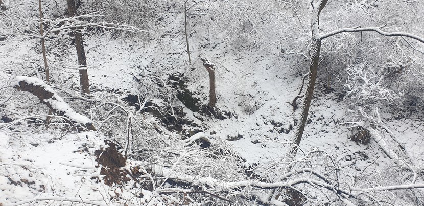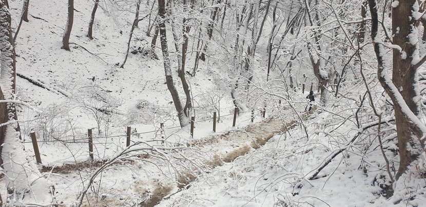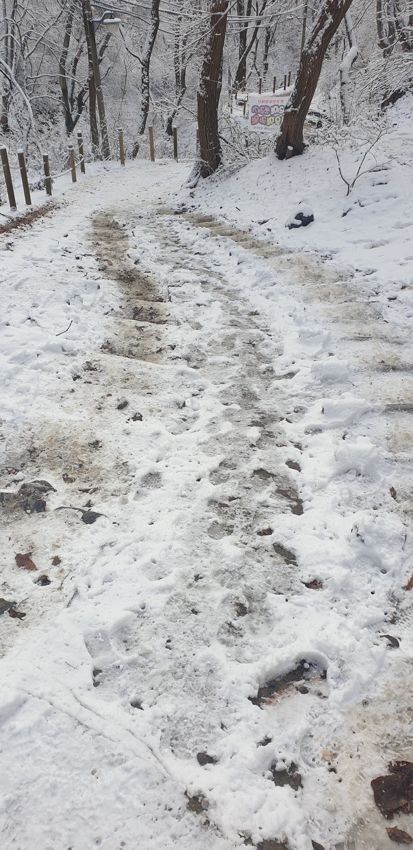 설산 풍경 및 미끄러운 산길
