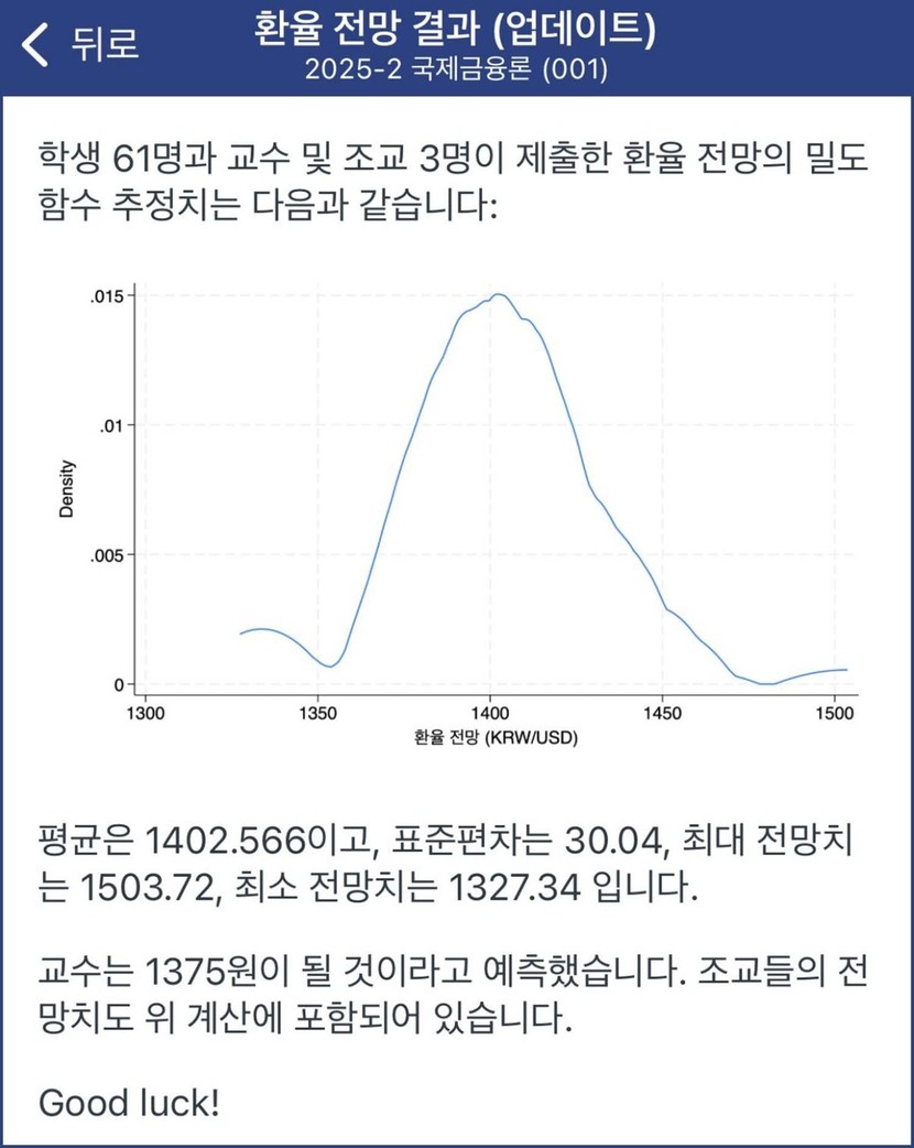 해당 수업의 강의안에 따르면 학생 61명과 교수, 조교 3명이 제출한 환율 전망의 함수 추정치 평균은 1402.56원이었다. 표준편차는 30.04, 최대 전망치는 1503.72원, 최소 전망치는 1327.34원이었다. 교수는 1375원이 될 것이라고 예측했다. 조교들의 전망치도 이 계산에 포함됐다.