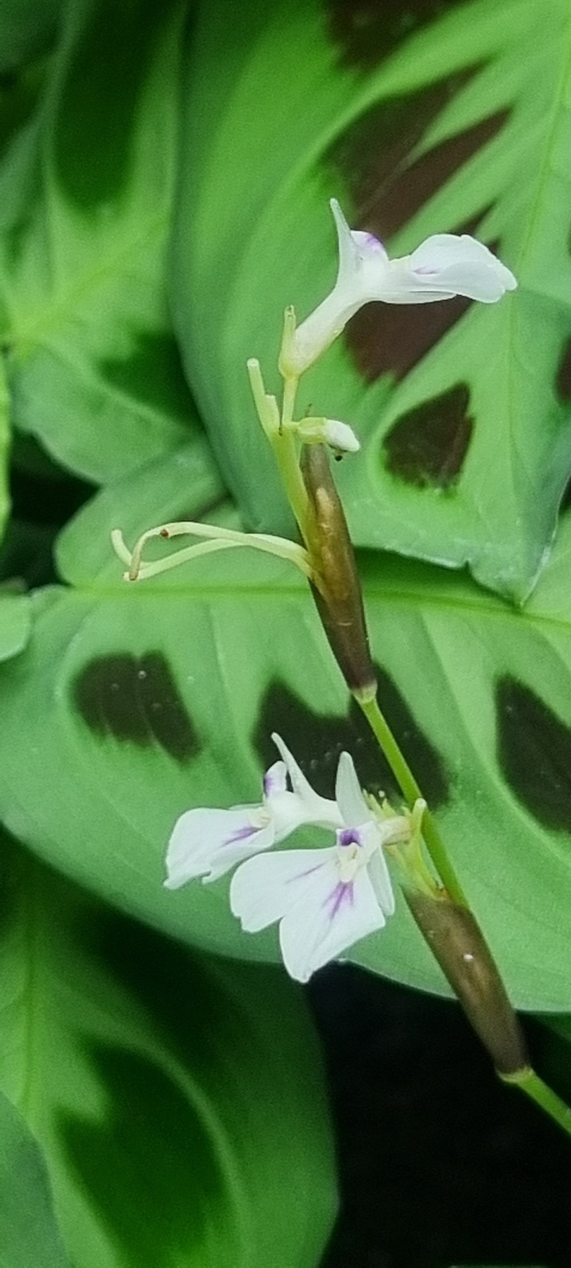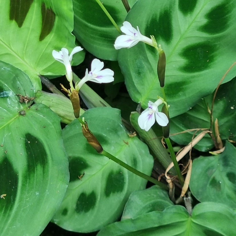줄기 끝에 작은 꽃이 연자주색으로 핍니다. 줄기는 보통 옆으로 누우면서 자라며 줄기잎은 타원형입니다. 벨벳 질감의 잎에는 녹색과 잎맥을 따라 나 있는 붉은색의 가시무늬가 있습니다. 잎자루와 잎 뒷면은 자주색입니다. 잎은 습도를 유지하기 위해 낮에는 옆으로 퍼져 있다가 밤이 되면 위로 모이는 특징이 있습니다.