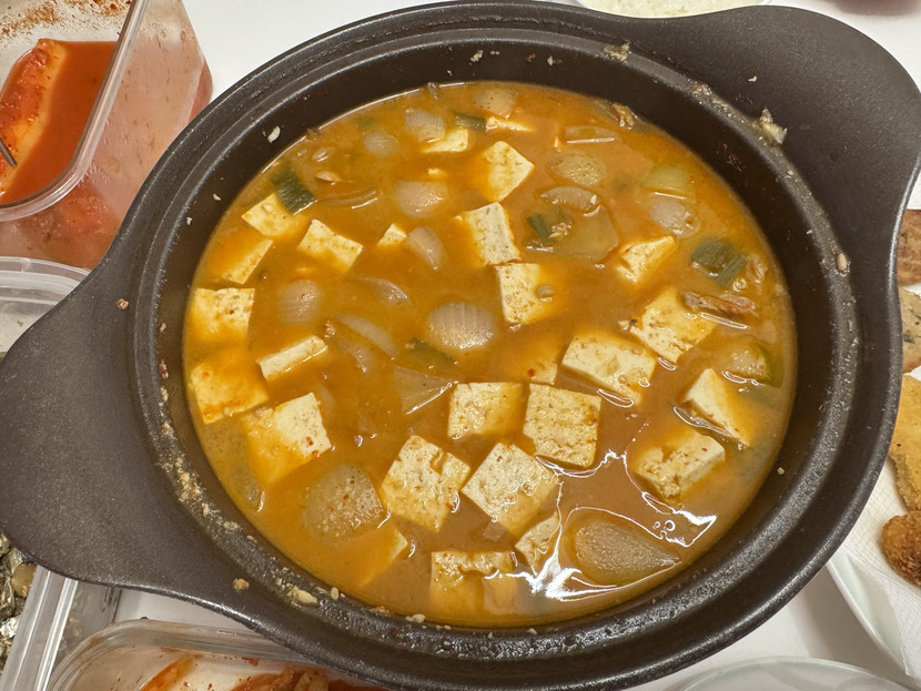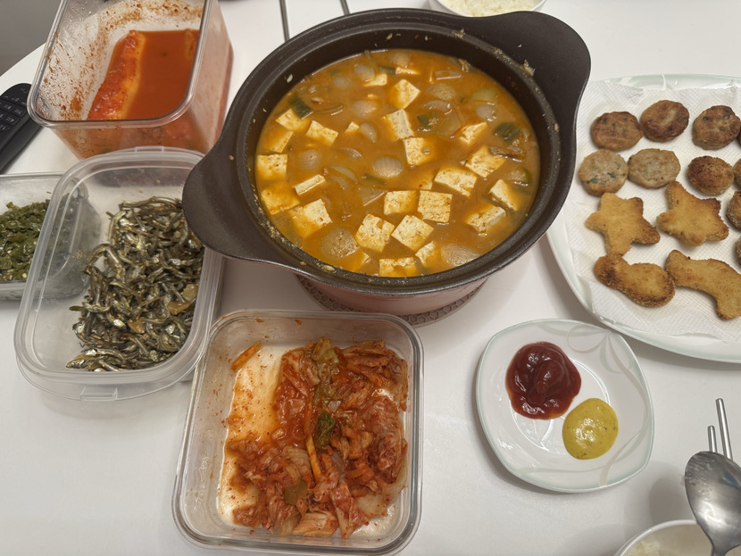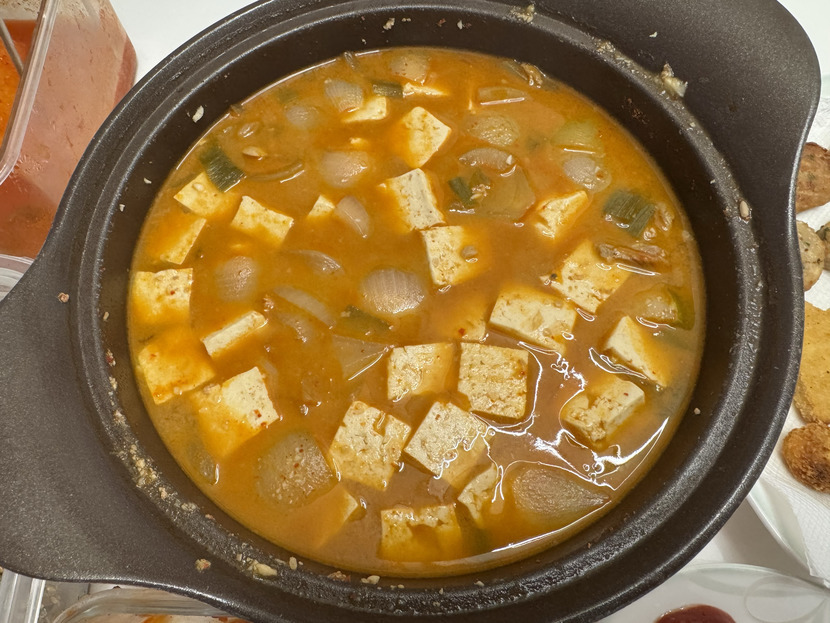 뜨끈뜨끈 돼지두부된장찌개 한솥끓여서 미니돈까스 치킨너겟 동그랑땡이랑🥘