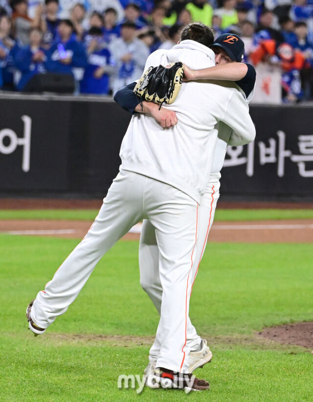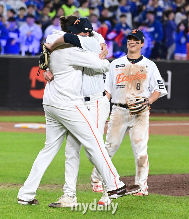 2025년 10월 24일 오후 대전한화생명볼파크에서 열린 '2025 신한 SOL BANK KBO 포스트 시즌' 삼성 라이온즈와 한화 이글스의 플레이오프(PO) 5차전 경기. 한화 폰세와 와이스가 11-2로 승리하며 한국시리즈 진출을 확정한 뒤 기뻐하고 있다./마이데일리2025년 10월 24일 오후 대전한화생명볼파크에서 열린 '2025 신한 SOL BANK KBO 포스트 시즌' 삼성 라이온즈와 한화 이글스의 플레이오프(PO) 5차전 경기. 한화 폰세와 와이스가 11-2로 승리하며 한국시리즈 진출을 확정한 뒤 기뻐하고 있다./마이데일리[마이데일리 = 이정원 기자] "한 번 이글스는 영원한 이글스."