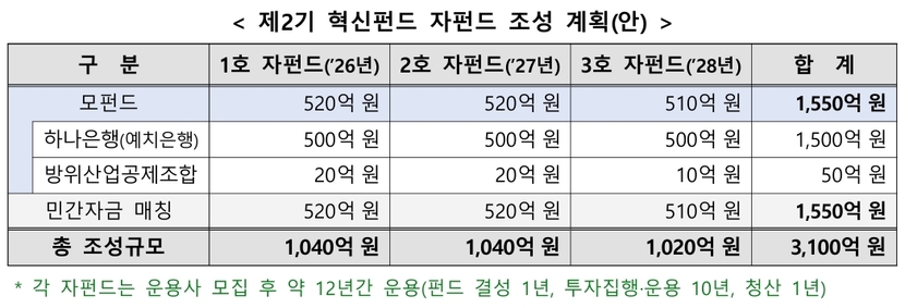 예치은행인 하나은행은 모펀드 조성을 위해 1,500억 원을 출자할 계획이며, ‘방위산업공제조합’*도 최근 방산분야 투자의 중요성에 공감하여 50억 원의 모펀드 출자를 통해 제2기 혁신펀드 조성에 새롭게 참여했습니다. 이에 따라, 모펀드 자금에 민간자금을 매칭해 총 3,100억 원 규모의 펀드가 조성될 예정입니다.