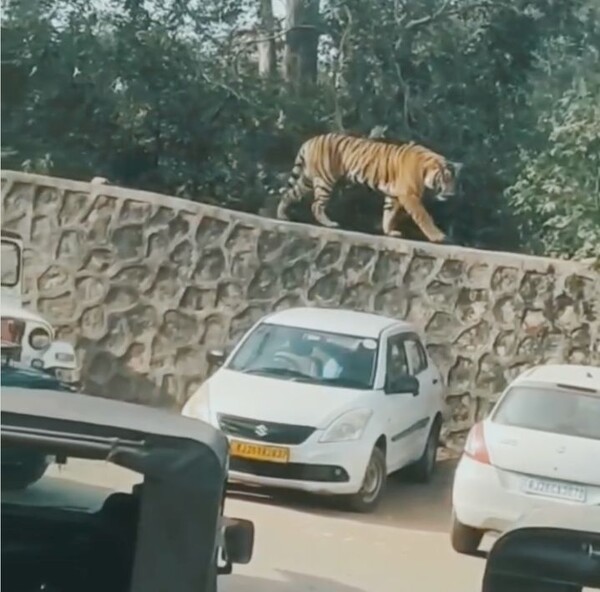 영상 속에서 새끼 호랑이는 인간의 존재에 크게 동요하지 않은 채 요새 인근 경계벽을 따라 침착하게 걸어 다닌다. 사파리 지프에 탑승한 관광객들은 가까운 거리에서 이 모습을 촬영했으며, 일부 차량은 새끼가 접근하자 조심스럽게 후진하는 모습도 포착됐다.