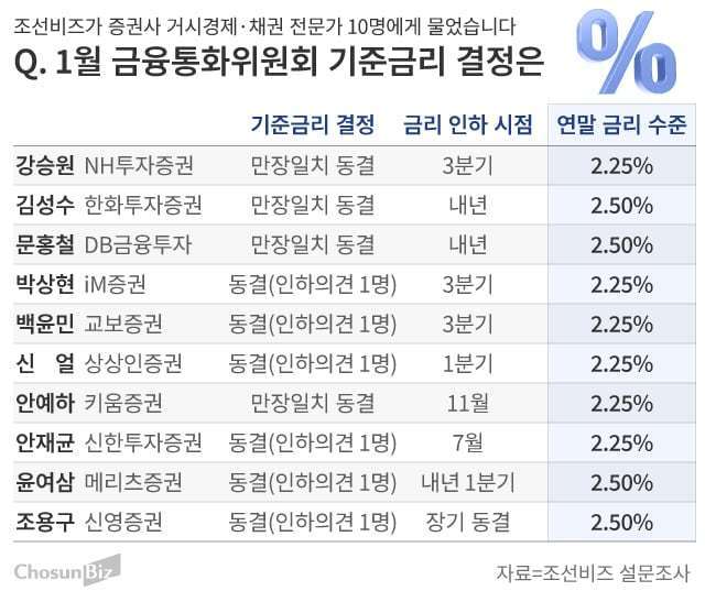한국은행이 15일 새해 첫 금융통화위원회 정례회의를 열고 기준금리를 결정한다. 국내 증권사 거시·채권 전문가 10명 전원은 한은이 기준금리를 현재의 연 2.5%로 동결할 것이라고 조선비즈에 밝혔다. 지금 기준금리를 인하하면 최근의 원·달러 환율과 주택 가격 상승 속도가 더욱 빨라질 수 있다는 것이다.