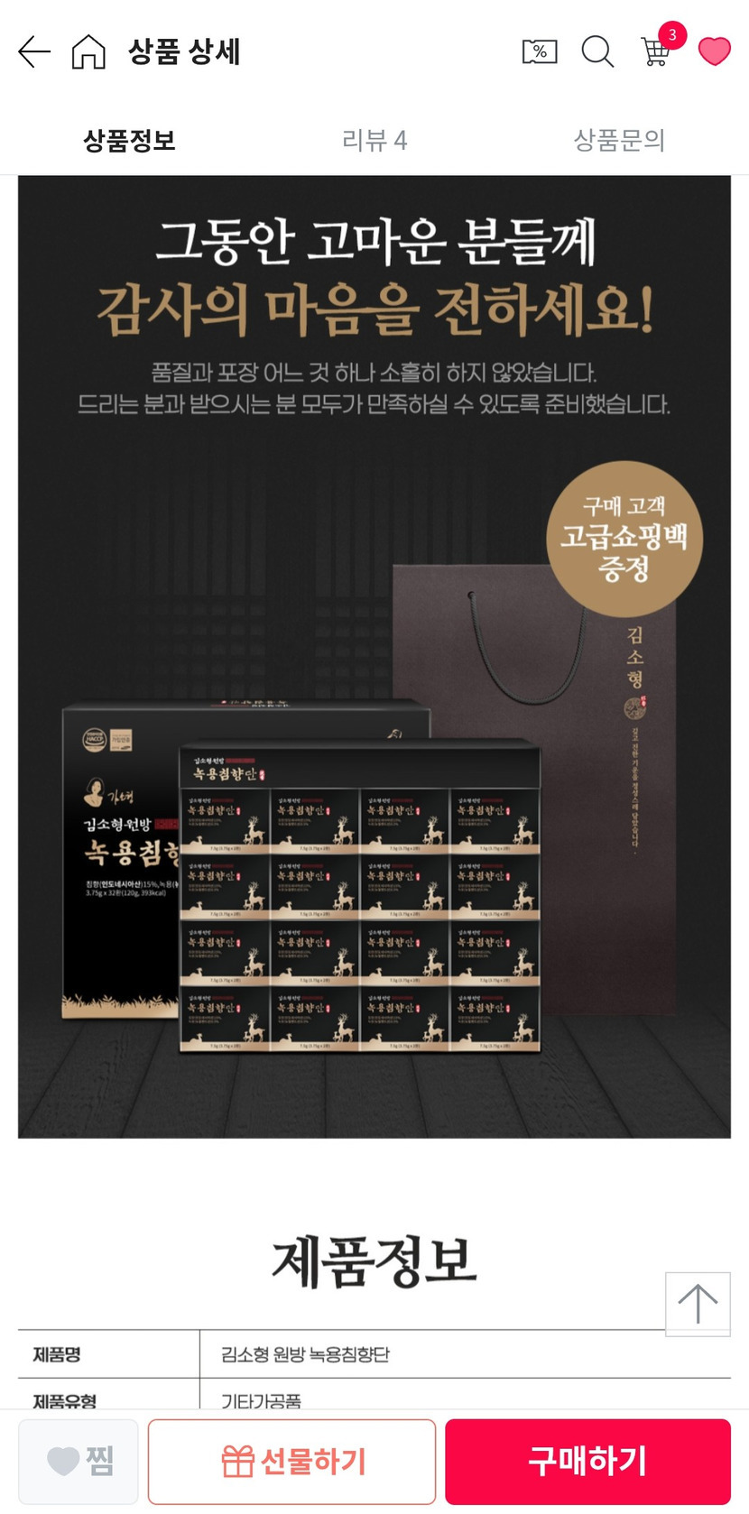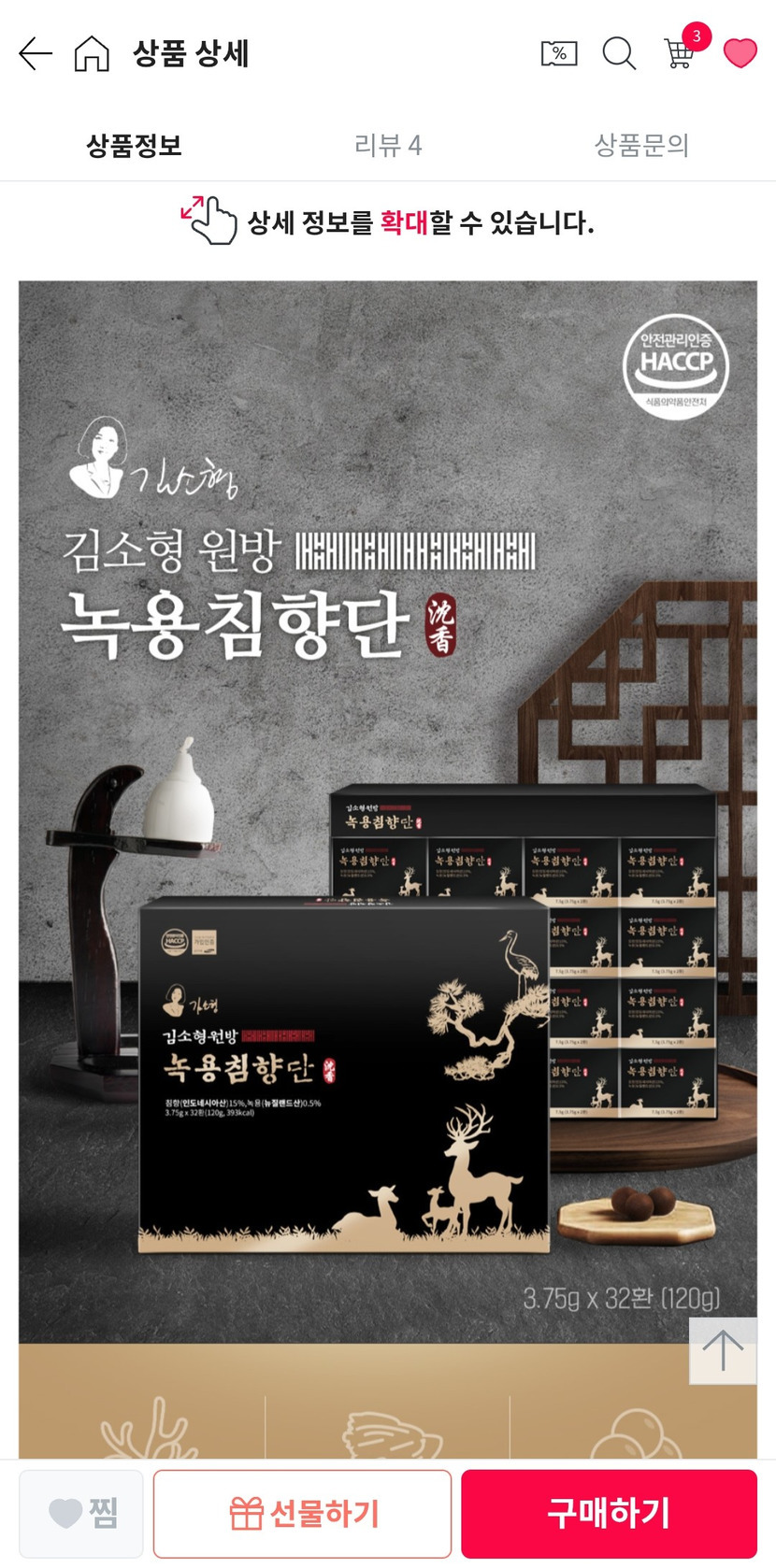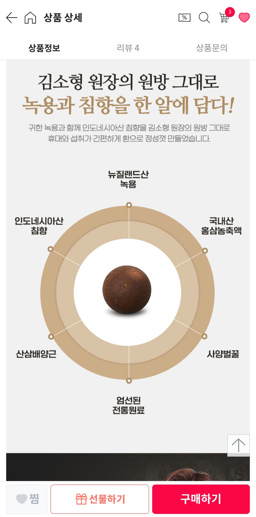 26.01.12 4,056 읽음 김소형 원방 녹용침향단 구입후기 천상무봉 구독하기 16 33 콘텐츠의 수익 344 함유된 성분이 좋이....어머님 효도선물용으로 좋아요. 적극추천합니다. 33 0 / 300 입력
